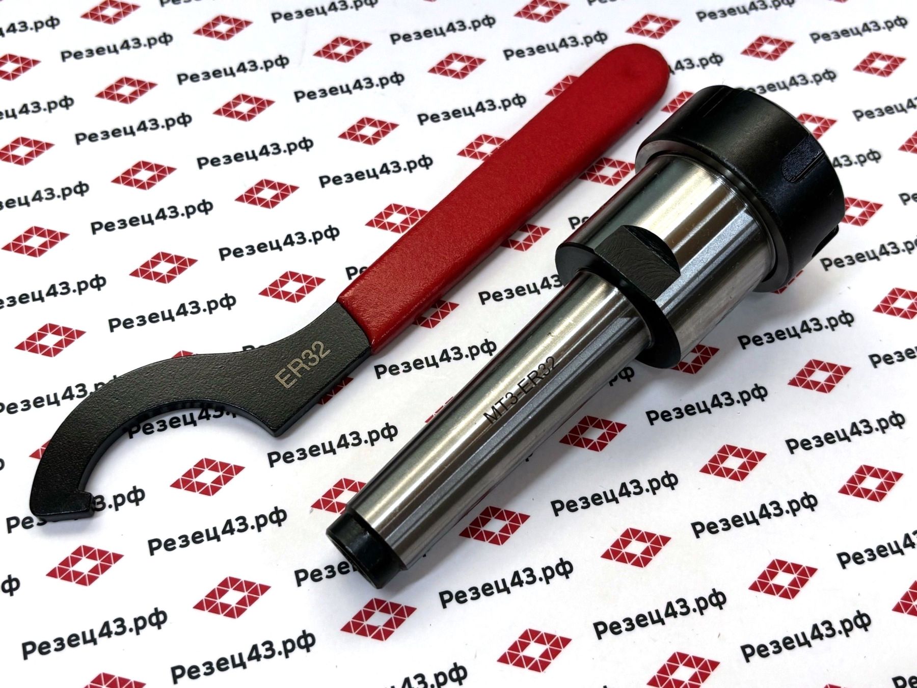 Цанговый патрон с конусом Морзе 3 (КМ3, MT3) с ключом и с набором высокоточных цанг ER 32 в деревянном кейсе.