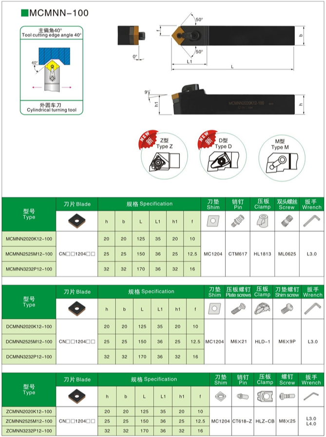 Державка токарная MCMNN-100 с креплением типа M (крепление рычажного типа). С углом в плане 40°. Для наружной обработки. Под пластины типа CN**